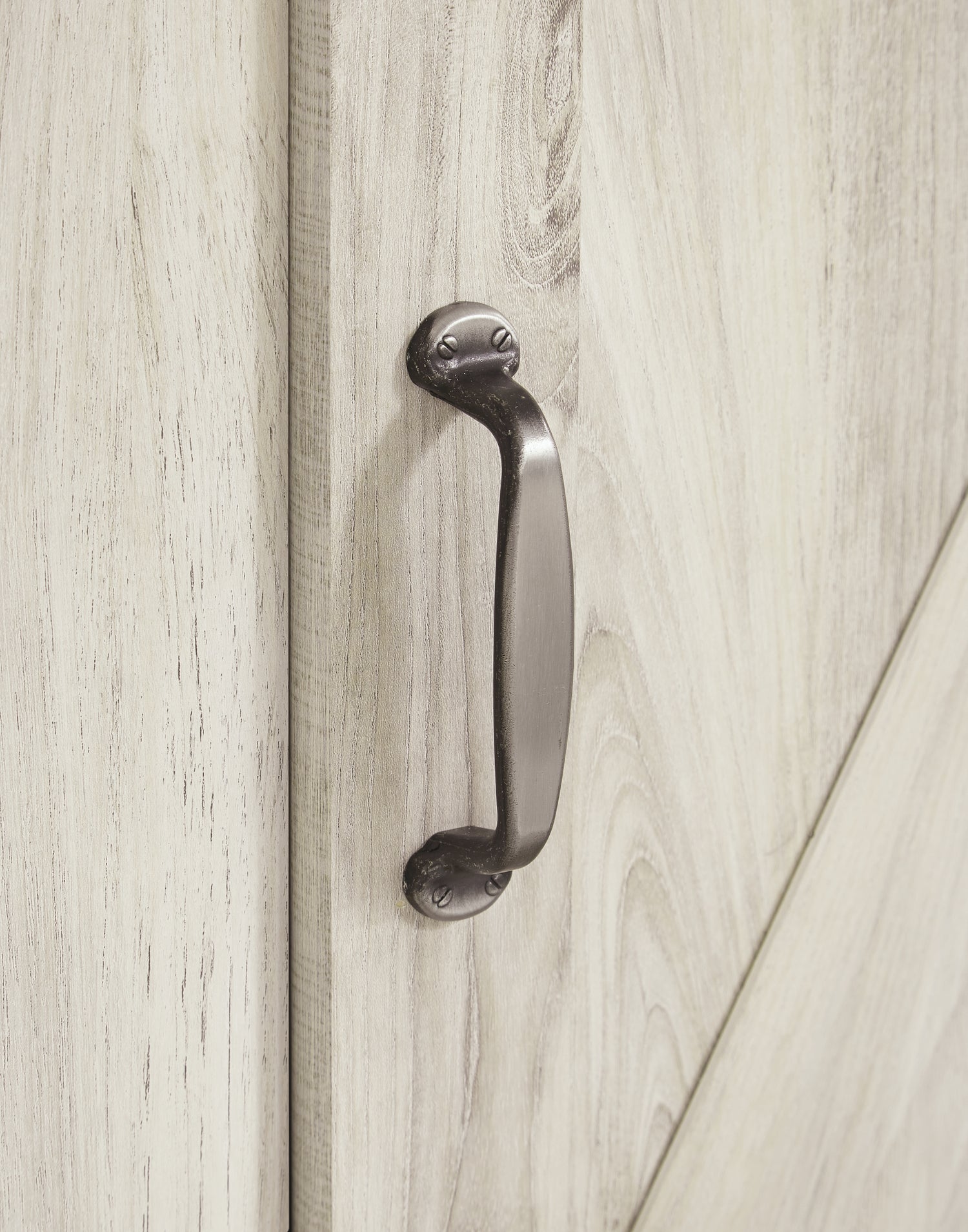 Express your modern farmhouse style with this entertainment center. Its wispy white finish over replicated oak grain is a delightful change from the ordinary. Clean-lined, classic styling with barn door inspiration provides a country-chic aesthetic that’s a breath of fresh air.
