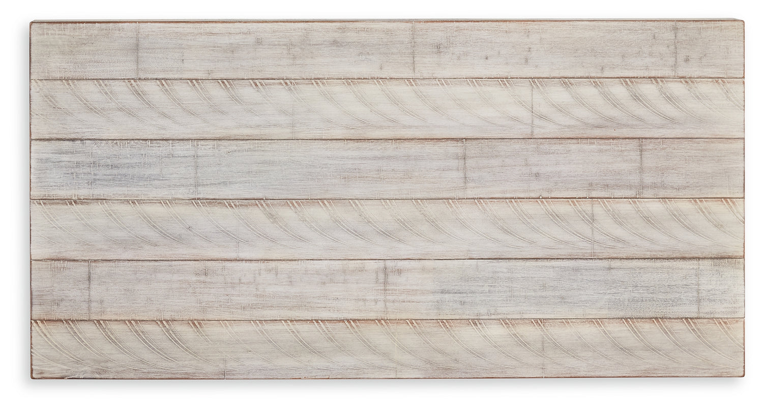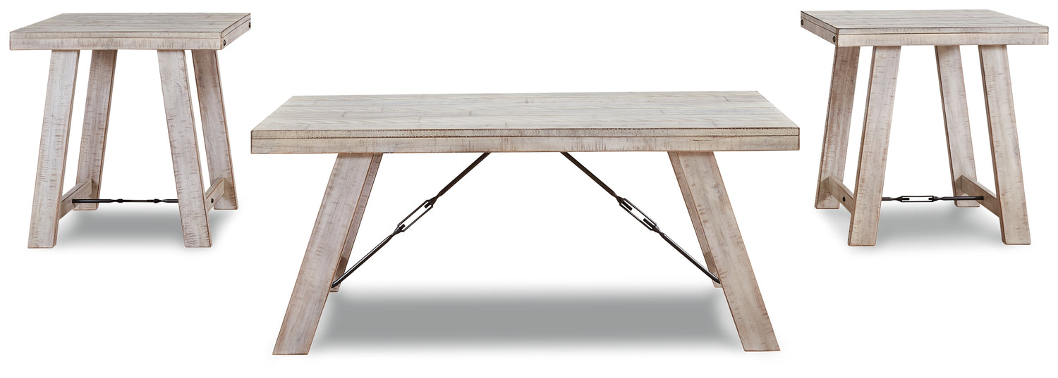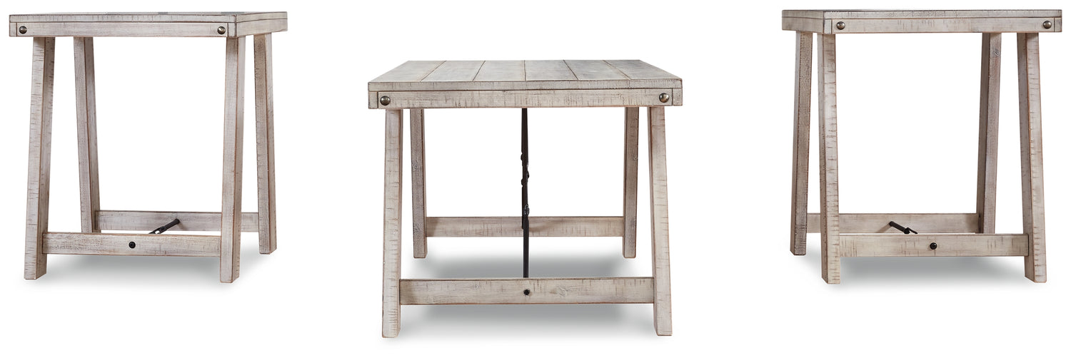 A rustic rendition of modern farmhouse style, this coffee table set is right in tune with your richly relaxed sense of style. The clean yet hearty profile is enhanced with a distressed whitewash finish and offset plank-effect tabletop. Decorative tension bar and nailhead accents add an industrial twist.