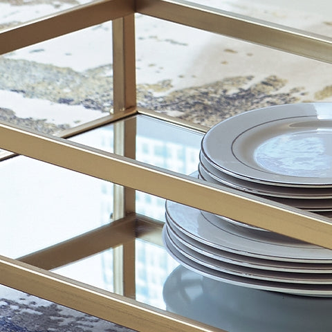 Whether used for serving up cocktails, showcasing succulents or creating dazzling displays, this bar cart does it with flair. The blend of clean lines, luminous goldtone finish and mirrored glass is a mastery in understated glam.