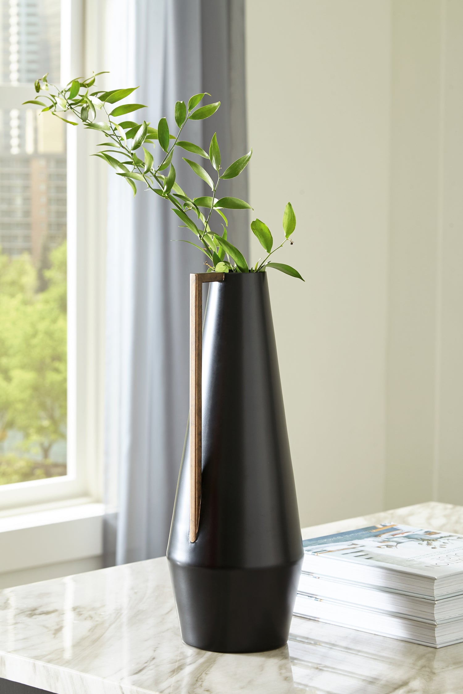 Keep your home contemporary cool from head to toe with this vase. Softly sloping in form, it's finished in a sleek black. An angular goldtone accent adds a dash of glam, creating a subtly dynamic overall design.