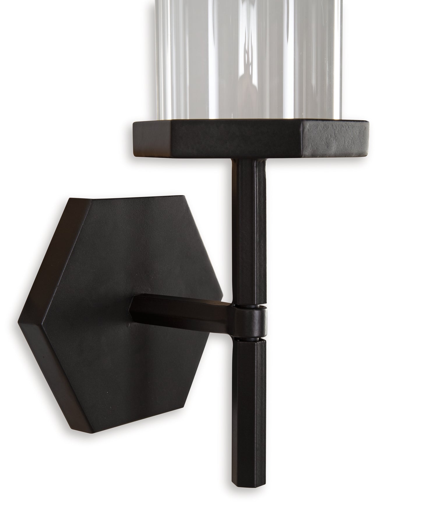 Unique and stylish, this hurricane pillar wall sconce complements all styles of interiors. With its geometric metal design and clear glass hurricane, the piece adds distinctive flair to your living space.