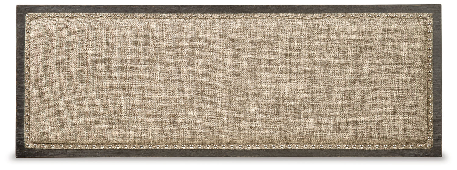 Invite your family into the heart of your home with this upholstered dining room bench. Its tapered legs provide a sturdy foundation, while the counter height design raises the bar on fine dining. With a textured black finish and heavy woven upholstery accented with silvertone nailhead trim, this is trend-right urban farmhouse style without all the fuss.