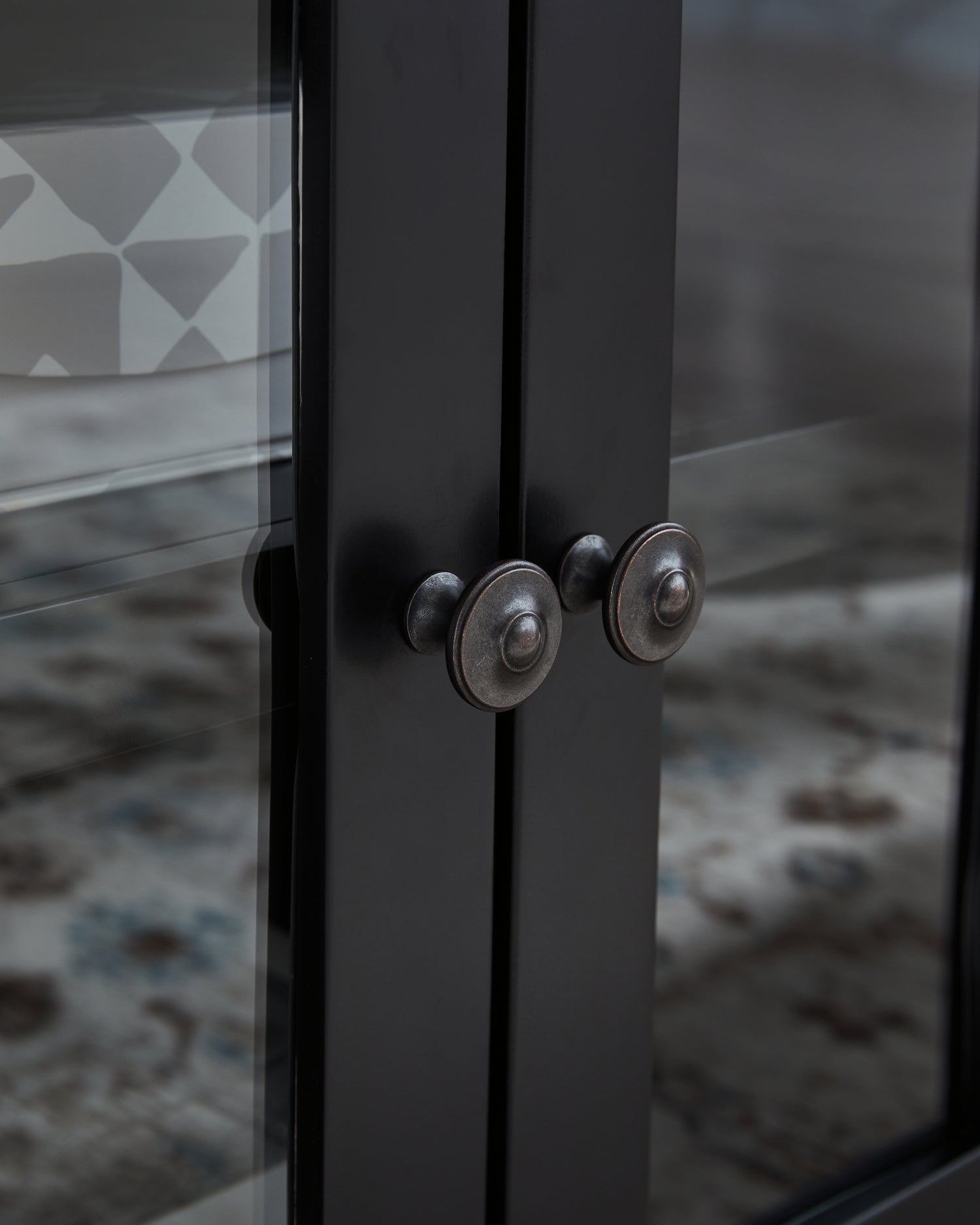 - Featuring glass door cabinets on each side with an adjustable shelf for extra storage space.