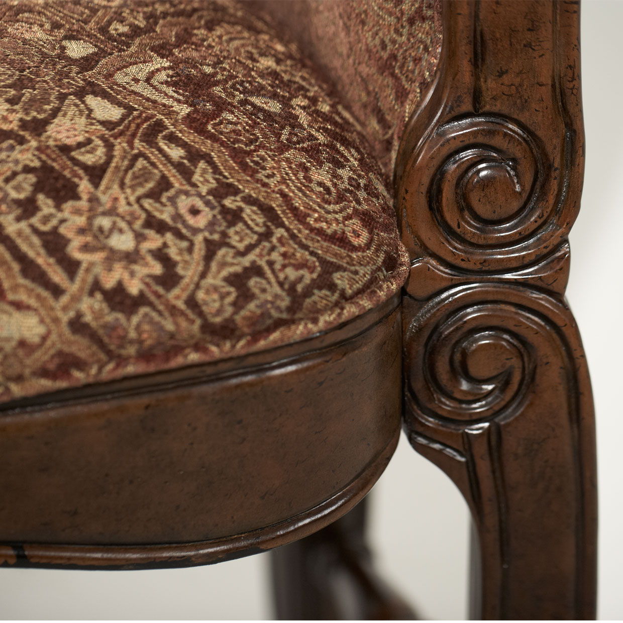- Intricately carved wood legs and frame