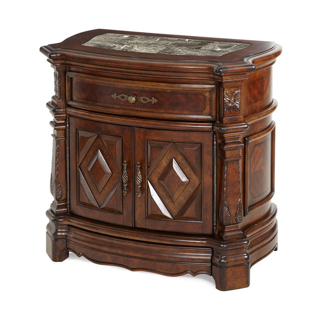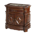 - Nightstand features a marble top and intricately carved wood